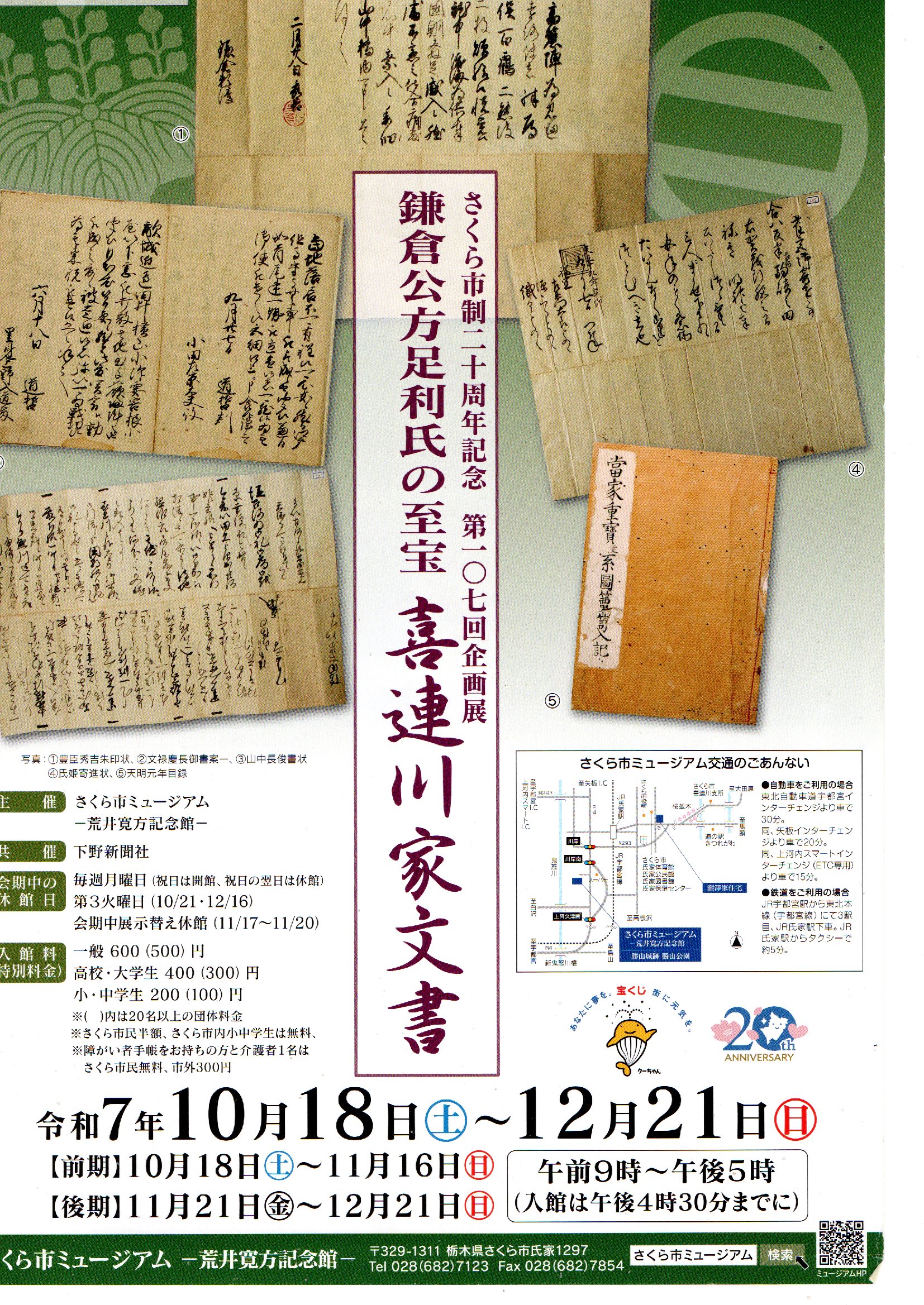 友人と栃木県、埼玉県を回った。タイトルは『喜連川家文書』である。鎌倉公方足利市の至宝が上に付き、さくら市制二十周年記念、栃木県指定有形文化財指定記念の展示である。この館では喜連川文書の展示を数回行っているが、今回は一番規模が大きい。まずエントランスホールを使ってパネル展示をしている。企画展示室では十四世紀から十八世紀までの喜連川家文書が並んでいる。鎌倉公方、古河公方、小弓公方そして喜連川家の歴史を文書で追っている。他には足利尊氏公木像、喜連川恵氏公木像、笄、栗形などが出ている。今回はここだけに終わらず常設展示室の一部屋を使って特に江戸時代の喜連川家文書を扱っている。戦国時代と比べて地味ではあるが、幕府内における喜連川家の位置付けがよく分かる。一つの武家文書がこれだけ残っているのは大変貴重であり、これからも調査研究が進むことを期待したい。刊行物は図録がある。