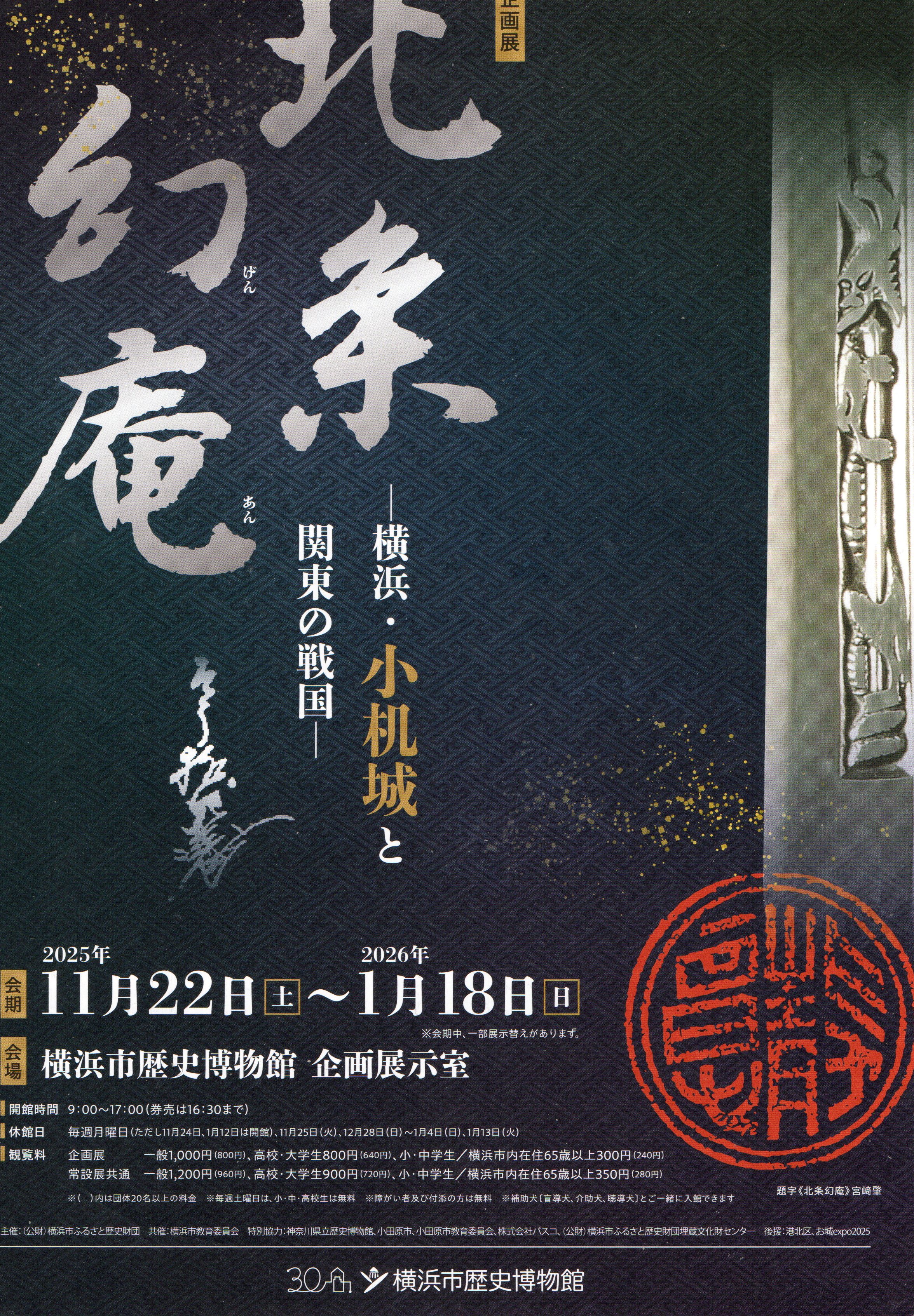 タイトルはずばり『北条幻庵』、サブタイトルは「横浜・小机城と関東の戦国」である。幻庵は戦国大名北条宗瑞の子であり、北条五代のほとんどを生き抜いた武将である。箱根権現社別当から還俗した。小机領を中心に約五千貫を領し久野村(小田原市)に住した。大きく幻庵、小机城、戦国の様相に分かれる。幻庵についてはその生涯、一族で兜鉢、北条幻庵朱印状などが出ている。小机城についてはその歴史と特に発掘成果がまとめられている。歴史は初代城主が幻庵の嫡男三郎であり、四代続いた。発掘は1964、65年の調査と2021、22年である。後者のほうは計6ヶ所のトレンチで終わっている。これからも継続的な調査が望まれる。城の縄張、性格についてはほとんど言及されていないのは物足りない。北条三郎坐像、北条氏光朱印状、出土遺物などがでている。北条氏を取り巻く情勢では上杉謙信の関東侵攻、武田・北条の再同盟、小田原合戦などで北条氏政書状、豊臣秀吉禁制や蒲原城址、小田原城址の出土遺物などが出ている。企画展示室の隣の体験学習室では小机城の発掘調査序章、小机小学校の考古遺物のミニ展示もある。刊行物は図録と出陳作品一覧がある。釈文集も欲しかった。図録には論考が5本載っている。北条氏全体の系図や年表があればもっと読みやすいと思った。ただ北条幻庵という人物についてはまだよく分かっていないというのが今の感想である。