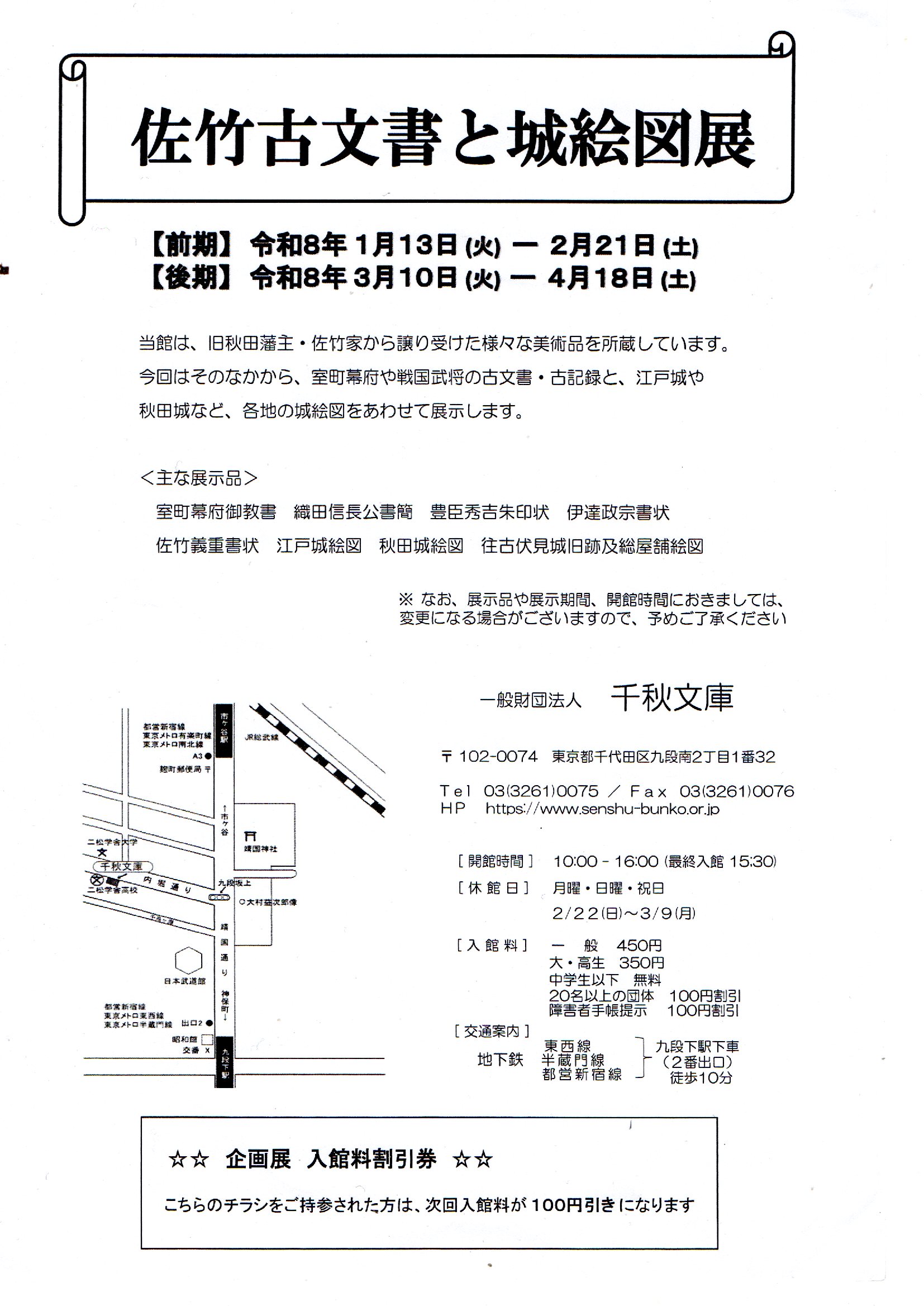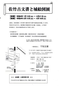 タイトルは『佐竹古文書と城絵図』である。大体の内容は想像できるが、城絵図展とあるので記すことにした。前期後期に分かれそれぞれ計32件である。古文書9件、城絵図12件、浮世絵6件、その他5件という構成である。最初は古文書であり、上杉謙信書状、黒田長政書状など佐竹氏に宛てたものが中心である。次の城絵図では久保田藩関連の他に仙台城、江戸城、大坂城などが出ている。どちらかというと控えや写が多い。刊行物は展示資料一覧のみである。今回は前期であり、後期は3月から始まる。半分ぐらい展示替えのようだが見に行くかどうかは分からない。