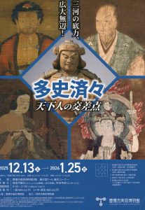 岡崎市から蒲郡市経由で豊橋市へ行く。こちらも開催最終日の見学であった。タイトルは『多史済々』、サブタイトルは「天下人の交差点」である。岡崎市美術博物館が休館のためその収蔵品の展示と思っていた。また、チラシに肖像画、仏画、甲冑などが載っていたのでそれらが主と考えていた。実際は前後合わせて計106件のうち岡崎市美術博物館蔵は7件のみでありほとんどは岡崎市内の寺社からのみのであった(寄託かもしれないが)。展示品の種類はバラエティーに富んでいるが半分ぐらいは古文書であった。
